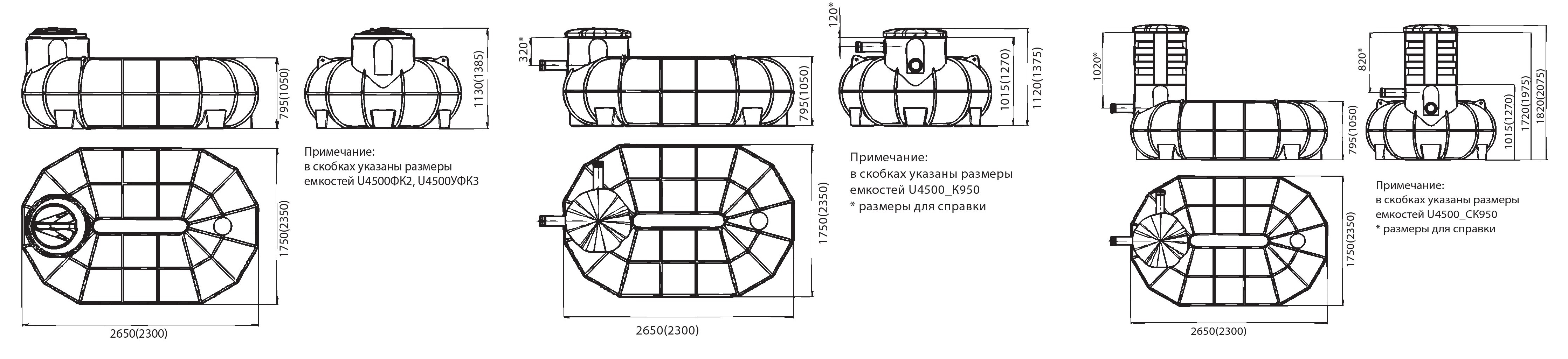 Емкости U2000_СК_К590® объемом 2000 л и U4500_СК_К590® объемом 4500 л, устанавливаемые ниже глубины промерзания земли, предназначены для накопления и хранения разнообразных жидкостей. Высота горловины данных емкостей увеличена на 700 мм за счет дополни- тельной проставки. Емкости комплектуются крышками в виде декоративного камня, диаметр отверстия в люке 590 мм. Глубина залегания входной трубы от 120 до 1020 мм. Конструкция данных баков защищена Патентом РФ.