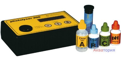 прибор Photolyser 400, 3 изм. кюветы с пробкой, мешалка, реагенты для определения содержания свободного и общего хлора, брома, озона, pH, dinofresh; 4 батарейки (миньон)