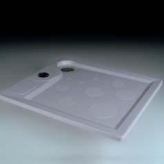 Размеры 80 см x 90 см. Дренажная решетка из полированной нержавеющей стали, расположенная вне площадки для ног. Крашеный поддон из полиэстера и стекловолокна противоскользящей формы