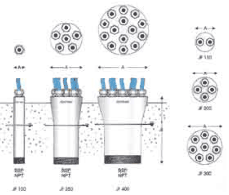Рассчитаны на вывод от 1 до 24 кабелей. Используются уплотнения кабелей для двух типов диаметров. Закладные детали выполненные из бронзы серии Stub-Ups имеют PG16 и PG21. Уплотнение PG16 рассчитано на кабель диаметром до 9 мм, тип PG21 рассчитан на кабель диаметром от 9 до 15 мм. Кабельные выводы из нержавеющей стали комплектуются муфтами для кабеля диаметром 7-10 мм и 8-13 мм. |